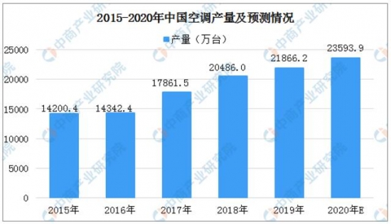 據(jù)國家統(tǒng)計(jì)局?jǐn)?shù)據(jù)顯示:2019年我國空調(diào)總產(chǎn)量為21866.2萬臺(tái),相比2018年提升6.74%。據(jù)中商產(chǎn)業(yè)研究院預(yù)測(cè),2020年我國空調(diào)總產(chǎn)量將達(dá)23593.9萬臺(tái)。