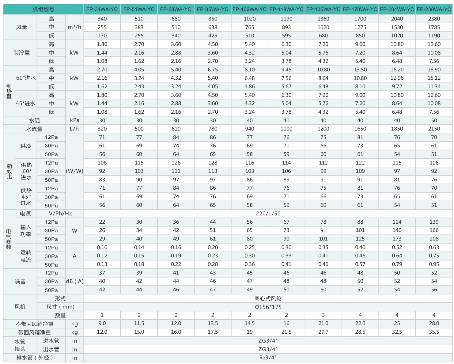 表中機(jī)組性能參數(shù)均在220V~/50Hz電源測試下所得。